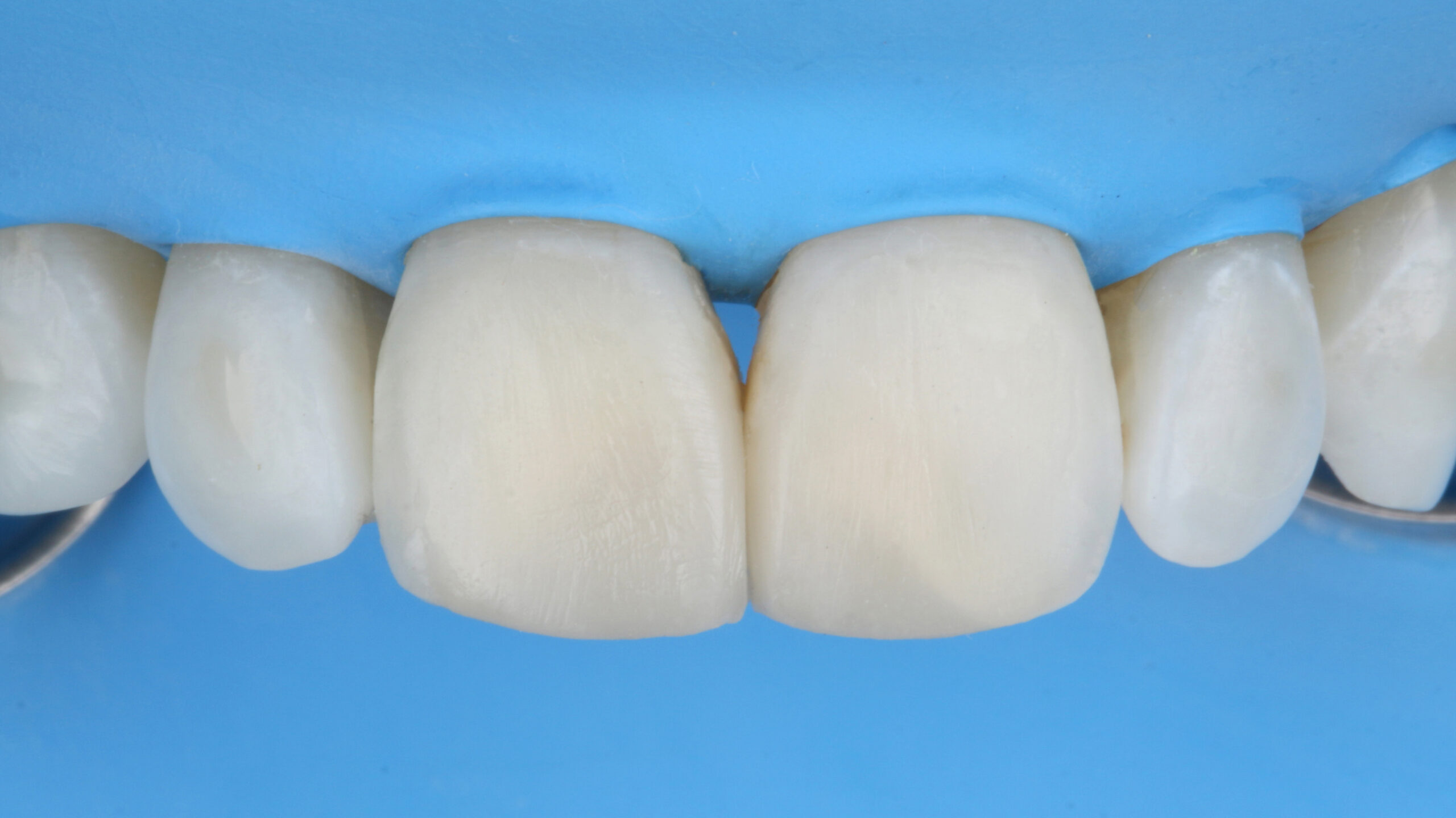 We begin the Class IV restorations in teeth 11 and 21, with the application of palatal enamel using a silicone guide. After positioning the guide in the mouth, check the adaptation and the material was light-cured. The image shows the appearance after the application of the 3M™ Filtek™ Easy Match Universal Restorative Bright shade for the reconstruction of palatal enamel.