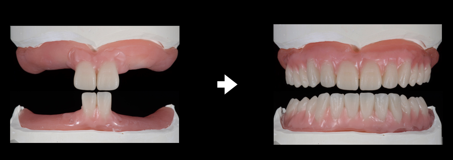 Individual setup of acrylic teeth’s using wax on the acrylic denture base, following the patient’s skeletal type: Skeletal Class Angle II-1 and high gonial angle.