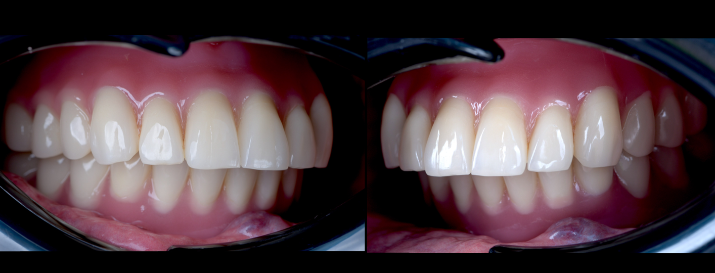 Final maxillary and mandibular removable dentures. Setup of acrylic teeth in removable dentures is made according to the patient’s skeletal type: Skeletal Class Angle II-1 and high gonial angle.