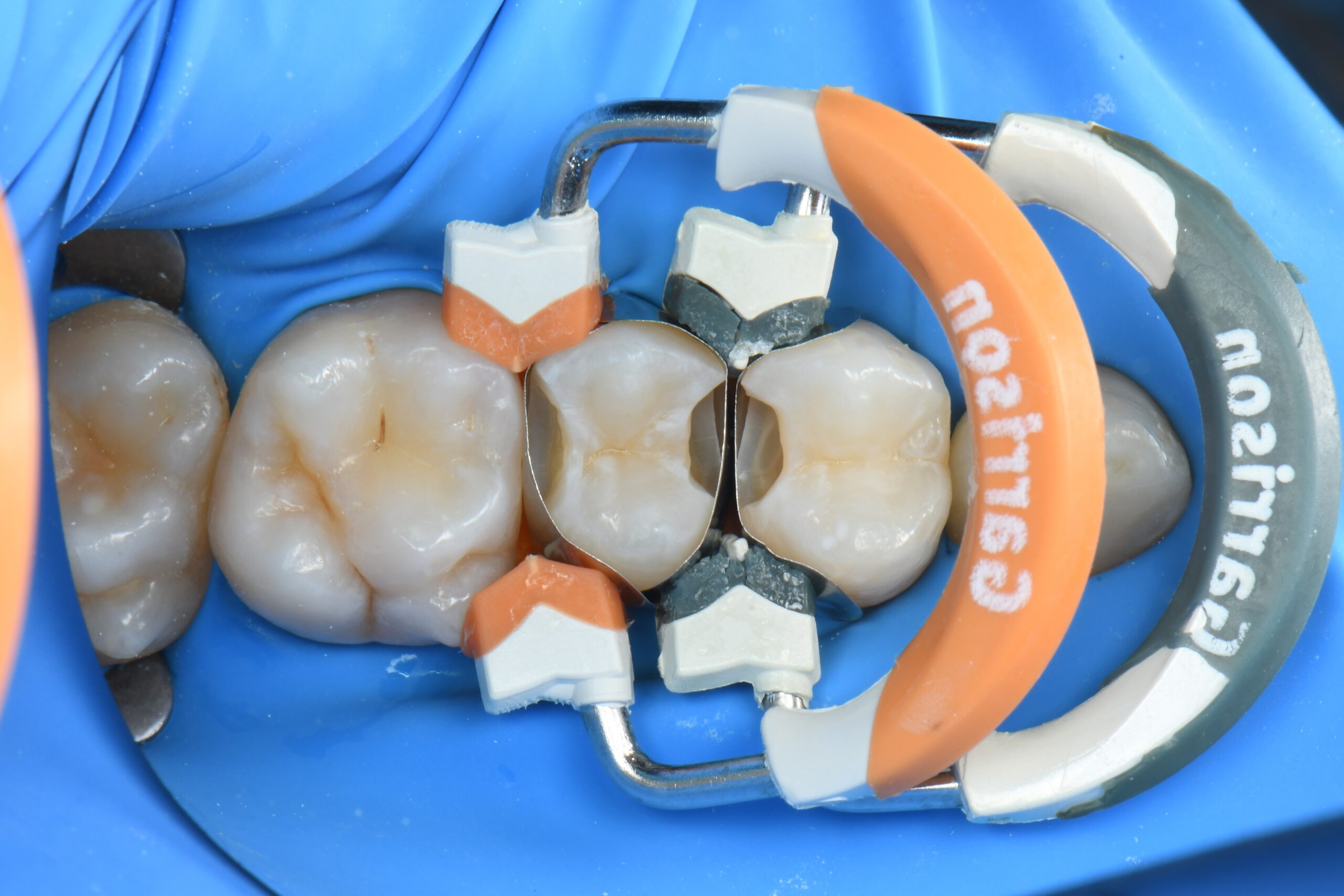 Sectional matrices, wedges and rings are properly placed, and selective enamel etching is performed
