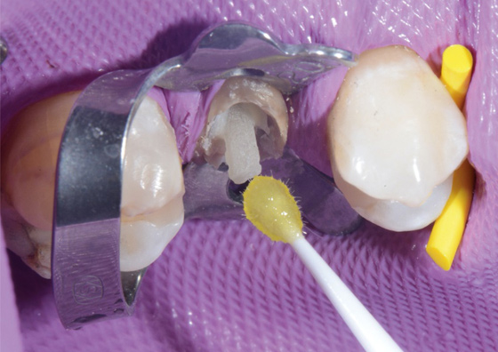 After post placement: Application of 3M™ Scotchbond™ Universal Plus Adhesive for core build-up followed by light-curing.