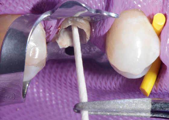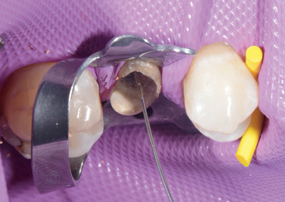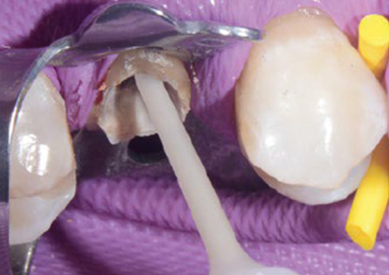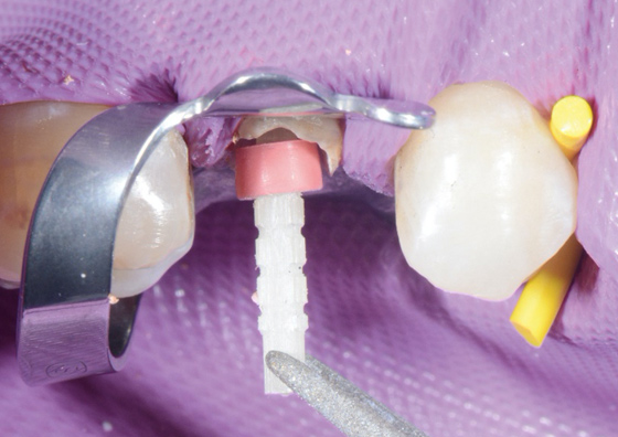 Try-in of the 3M™ RelyX™ Fiber Post 3D for length determination.