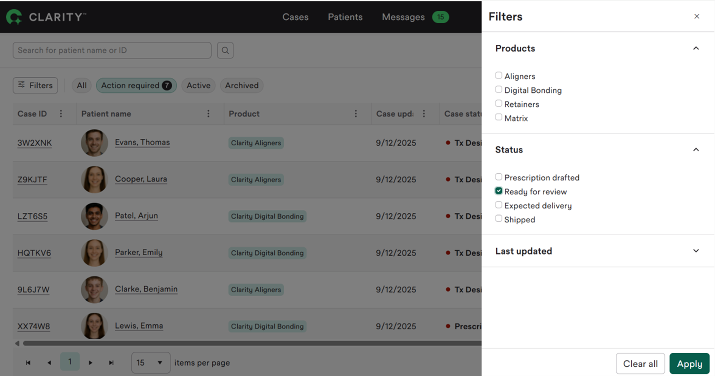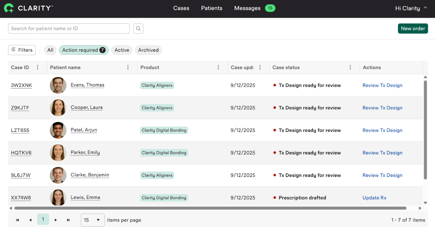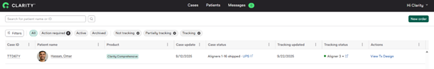 To improve the usability of the case list, the column previously labeled “Item” will be split into two columns. The two new columns are labeled “Product” and “Case status.” The product column may contain more than one product type if a patient has been prescribed multiple treatments, and Clarity Aligners cases will list the treatment package in the product column (e.g. “Clarity Comprehensive” or “Clarity 20”).