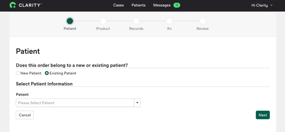 Archived patients will also be surfaced in the Rx when a user indicates that the new order belongs to an existing patient. When the new order is initiated, the patient will transition back to active status and will appear as active when the case list is filtered.