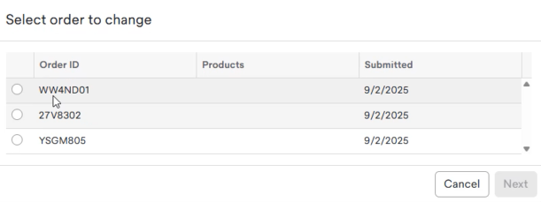 Other actions that apply to the case such as new order, change shipping location, change order, place order on hold and cancel order, will still be available from the drop-down list above the upper right corner of the case details table. If one of the other actions is selected from the drop-down list, you may be prompted to select which order you would like the action applied to.