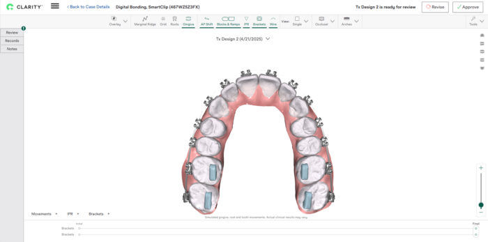 After the case is submitted and the scans are uploaded, Solventum will create and provide the first treatment design of Clarity™ Aligners or Clarity™ Digital Bonding. You can then revise your case, or approve it for production.