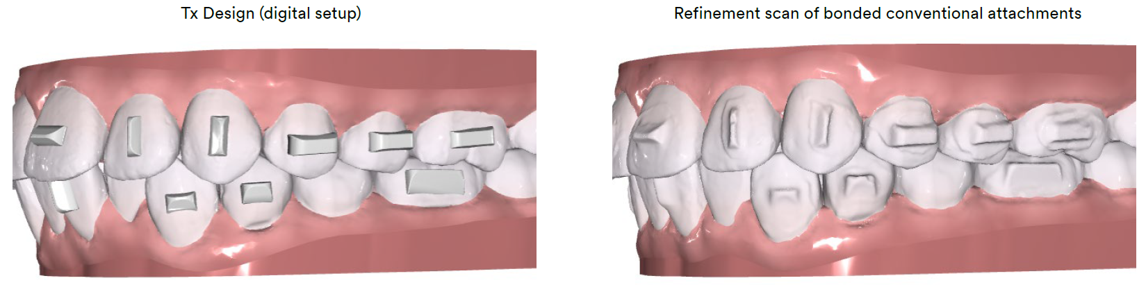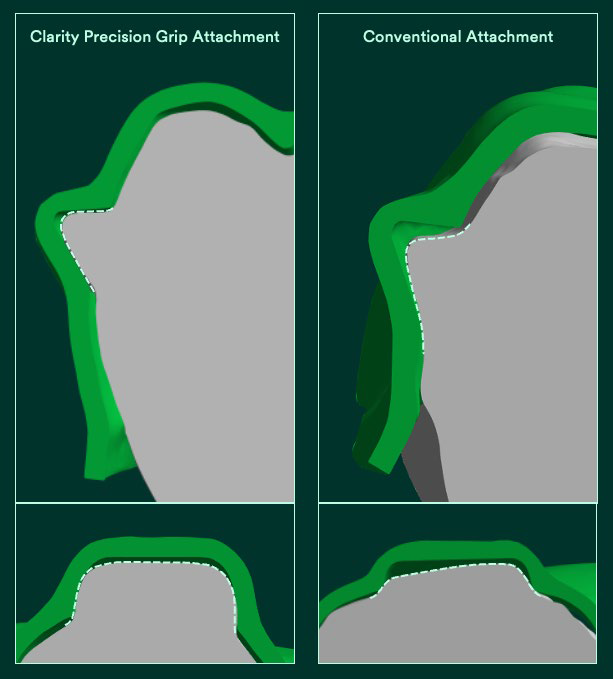 A comparison between attachments created via conventional attachment template — mold-in mouth method vs. Clarity Precision Grip Attachments can be seen in Figure 9.