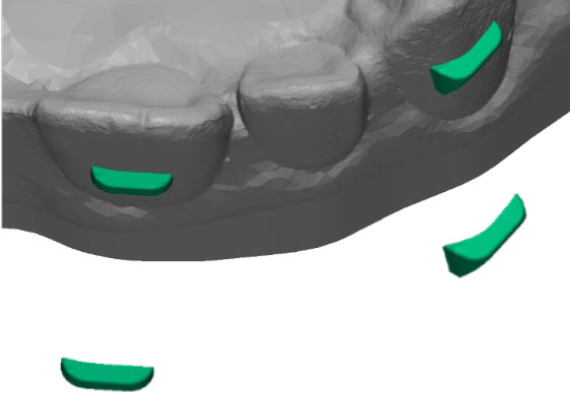 This demonstrates that the post-bonding results of Clarity Precision Grip Attachments closely mirror the precise shape and virtual placement in the Tx Design. To achieve optimal outcomes, it is crucial that the clinical reproduction of the attachments closely mirrors their virtual placement. This is particularly evident in Figure 8, a post-bonding scan of the Clarity Precision Grip Attachments in Figure 7.