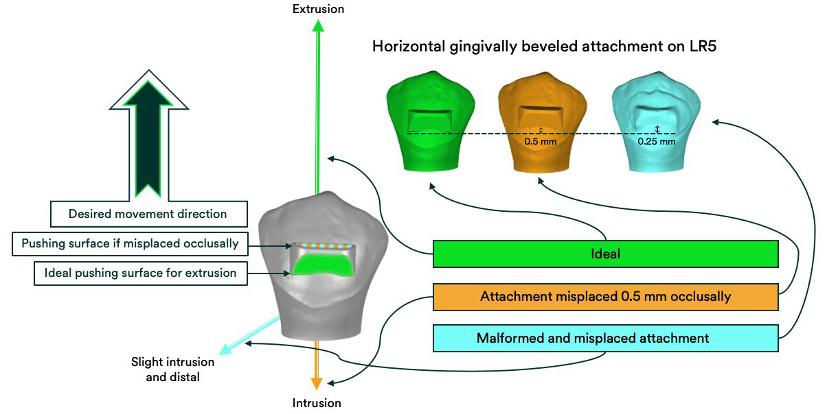 Figure 4: Simulations of the force vectors obtained when attachments are misplaced or malformed and misplaced. The green ‘ideal’ attachment expresses the desired force represented by the green arrow. The orange attachment is ‘misplaced’ 0.5mm occlusally, resulting in force expressed in the direction of the orange arrow, opposite from the desired ‘ideal’ force vector (green arrow). The teal attachment is misplaced and has significant flash, resulting in force being expressed incorrectly (teal arrow), again in a direction askew of the ‘ideal’ force vector (green arrow).