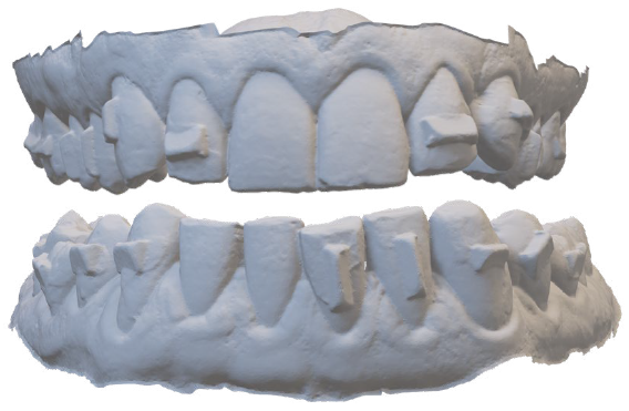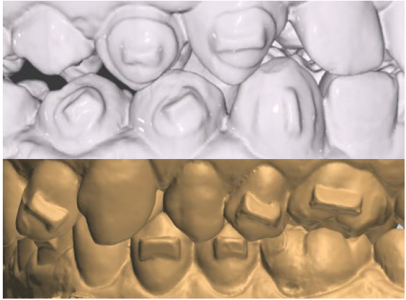Figure 9: Scans of attachments created via conventional attachment tray – mold-in mouth method – (top) vs. Clarity Precision Grip Attachments (bottom). Both scans were taken prior to any flash removal.